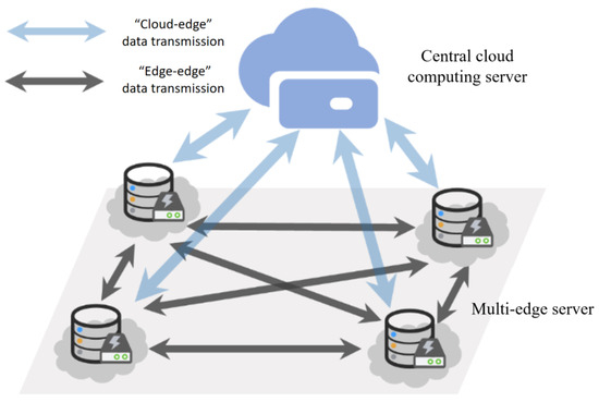 In practical application scenarios, edge servers are capable of communicating not only with one another but also with centralised cloud servers. This bidirectional data exchange capability establishes a highly dynamic and interconnected cloud–edge communication network, as illustrated in Figure 2. In terms of edge computing, this network plays a key role in the efficient and decentralised processing of data generated by a large number of IoT devices. However, the information traversing this network often has significant business value, ranging from sensitive user data to critical operational insights. Therefore, it is important to ensure the security of data transmissions within this network.