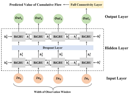 In the content of the input layer demonstrated in Figure 4, represents the input data of a certain data window after the raw information of the cumulative flow size in each historical time period has been preprocessed.The dimensions of the input data of the BiGRU computation component are 3, which consists of the sequence length (), the batch size (), and the dimensions of the input feature set (). Since only time-series features are analysed in the preset scenario of this paper, the value of is 1, and the specification of the input data can be expressed as . Sequence length is determined by the width of the observation window of the data , and therefore the width of the observation window needs to be set reasonably in order to ensure the integrity of the data. Batch size refers to the size of the data volume integrated during batch processing, and batch training is generally used for models with large data volumes to prevent their memory leakage.
