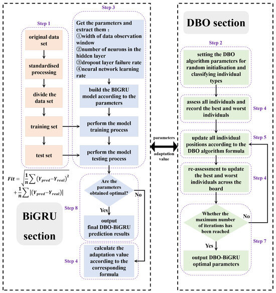 (3) DBO unit: This unit is responsible for optimising four important hyperparameters in the BiGRU prediction model, i.e., the width of the data observation window, the number of neurons in the hidden layer, the dropout layer failure rate, and the neural network learning rate, as described in Section 3.2.2. The overall architecture of the DBO-BiGRU prediction model is shown in Figure 5. The overall modelling process for optimising BiGRU based on the DBO algorithm is described below: