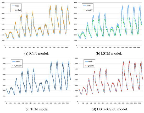 According to the parameters set in Table 1 and Table 2, under the dataset , the best parameters of the BiGRU model output after the iteration of the DBO algorithm is completed are 12, 46, 0.01, and 0.0024. The parameters of the RNN, LSTM, and TCN models are randomly generated and set to be the same, and all of them will be iterated 50 times. The relevant parameters are shown in Table 3.