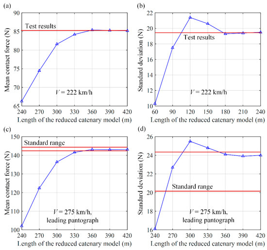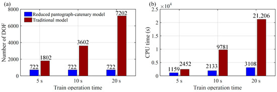- The proposed reduced pantograph–stitched-catenary model can efficiently and accurately investigate the dynamic behavior of pantograph–stitched-catenary interactions. When calculating the pantograph–catenary-interaction dynamic responses, the calculation time of the present model is only 1/7 of that of the MSM with a train operation distance of 1200 m. This greatly benefits the investigation of the long-term service evolution of the pantograph–stitched-catenary system, such as the wear rate calculation in pantograph contact strip wear investigations.