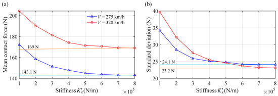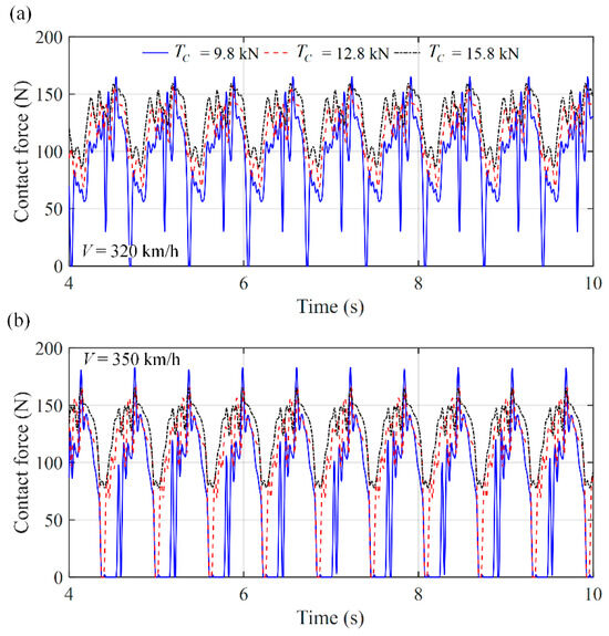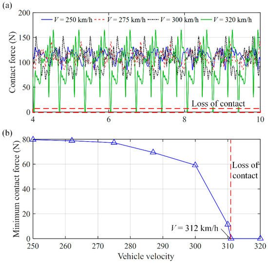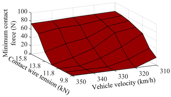 - When the train operation speed is higher than the designed top speed of the SYT7.0/9.8 catenary system and up to 300 km/h, the pantograph–catenary interaction dynamic performance of the present pantograph–catenary system is still acceptable, and the risk of contact loss is small. However, when V = 300 km/h, the present pantograph–catenary system is not stable and is close to its critical state, which means that it can result in contact loss with a small change in the pantograph–catenary system parameters. Thus, it cannot operate at V = 300 km/h in the long term. To increase the maximum operation speed of the existing SYT7.0/9.8 catenary system to 300 km/h, the contact wire tension should be increased to 15.8 kN.