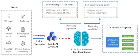 LLMs, leveraging the Transformer architecture and self-supervised pre-training strategies, have demonstrated remarkable capabilities in understanding and content generation [15,17]. However, developing a specialized LLM for sensitive data identification from scratch requires significant computational resources, which is impractical for most research teams. Therefore, it is necessary to select a general-purpose LLM as the base model and fine-tune it accordingly. Currently, it is challenging to determine which large language model performs better for specific tasks. From the perspective of data security, this paper chooses the newly released Llama3 (8B) as the experimental model, which is fully open-source and among the most advanced large language models currently available. The proposed framework in this paper includes the Llama3 base model, pre-training, LoRA fine-tuning, and other components. During the pre-training phase, names, identity card numbers, phone numbers, home addresses, etc., are labeled as sensitive data. The process of sensitive data identification based on the LLM’s API is illustrated in Figure 2.