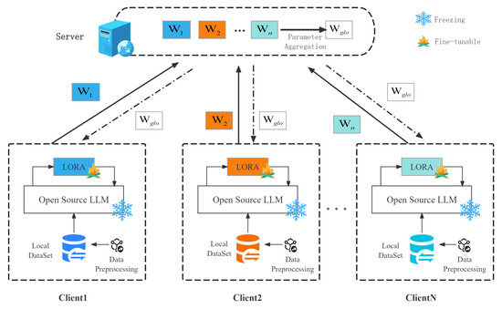 When adapting LLMs to vertical domains such as healthcare, finance, tourism, and others, the available training data may be privately owned by multiple clients. In such scenarios, to achieve decentralized training data while maintaining data localization and fine-tuning LLMs, federated learning methods are commonly employed. In federated learning, clients typically compute weight updates locally and then share these updates with other clients to globally update the LLM. However, this approach can impose communication and computational costs on clients. Nevertheless, LoRA, with its parameter efficiency and pluggability, can reduce communication costs and lower the demand for computational resources [30]. LoRA enhances the overall efficiency and scalability of federated learning. The process of LoRA fine-tuning based on federated learning is illustrated in Figure 3.