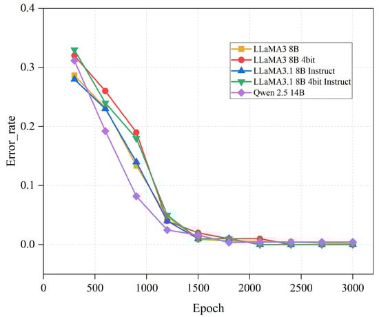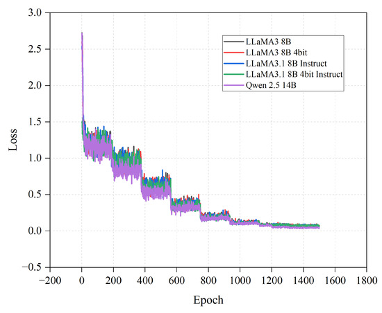 In this paper, the LLaMA3 model, with versions including LLaMA3 8B, LLaMA3 8B 4bit, LLaMA3.1 8B Instruct, LLaMA3.1 8B Instruct 4bit, and Qwen2.5 14B, was fine-tuned on the training set for 1500 epochs, taking 4.5 h, 2.6 h, 4.8 h, 2.8 h, and 6.5 h respectively. For large language models with massive parameters, this time overhead is considered acceptable [31]. During the fine-tuning phase, the loss function of the model after each iteration was tracked and recorded, and a nonlinear function was used for fitting. As shown in the experimental results, the loss function value rapidly decreased with the increase in the number of iterations. After exceeding 1120 iterations, the loss function value of the model remained stable, indicating that the model has good convergence.