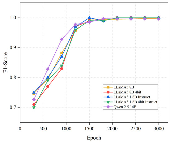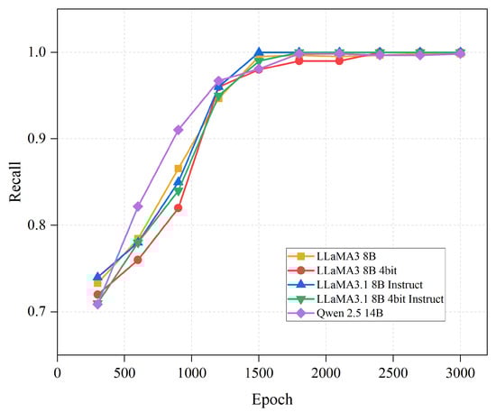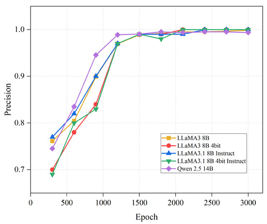 The model’s accuracy is approximately 70%. As the number of iteration epochs increases, this ability improves significantly. Overall, the LLaMA3 8B and LLaMA3.1 8B Instruct versions perform better than the LLaMA3 8B 4bit and LLaMA3.1 8B Instruct 4bit versions in terms of model performance. After completing 2100 epochs of fine-tuning, this capability metric approaches 100%. The convergence speed of the accuracy of the Tongyi Qianwen Qwen2.5 14B model is faster as the number of iterations increases, reaching close to 100% after completing 1800 iterations.
