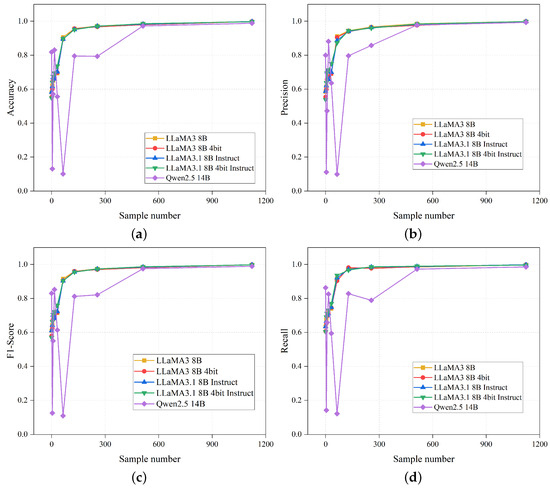 Analysis of the impact of fine-tuning sample size. (a) The impact of th sample number on accuracy. (b) The impact of the sample number on precision. (c) The impact of the sample number on F1-Score. (d) The impact of the sample number on Recall.