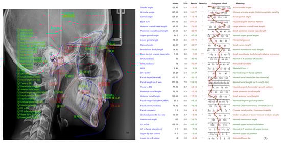 (a) WebCeph line analysis, displaying the y-axis to SN, anterior facial height, and posterior facial height; (b) WebCeph chart, presenting the mean values, standard deviation, resulting values, severity, polygonal charts, and their interpretations.