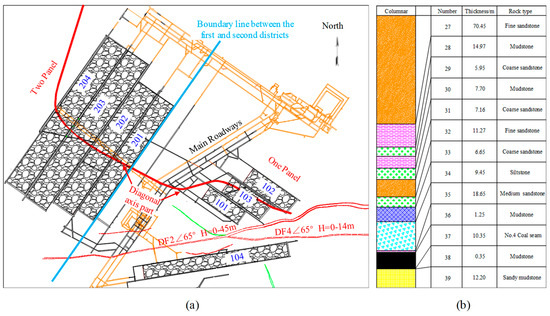 Figure 1 shows the mining plan for and the comprehensive borehole stratigraphic column in the main roadways in the Gaojiapu coal mine. The overall structure of the coal seam in the Gaojiapu coal mine was simple, with an average thickness of 10.35 m, a dip angle of 2–11° degrees, and a burial depth of 800–1000 m. The ground stress in the area of the mining activities was relatively large, with the maximum horizontal stress ranging from 37.29 to 38.67 MPa. The immediate roof of the coal seam was 18.65 m of medium-grained sandstone and the immediate floor was mainly composed of sandy mudstone. The main roadways (including the auxiliary transportation roadway, belt roadway, and return air roadway) were located in the No. 4 coal seam, with a distance of 35 m between each main roadway, and combined support was provided in the form of a bolt–cable–anchor net.