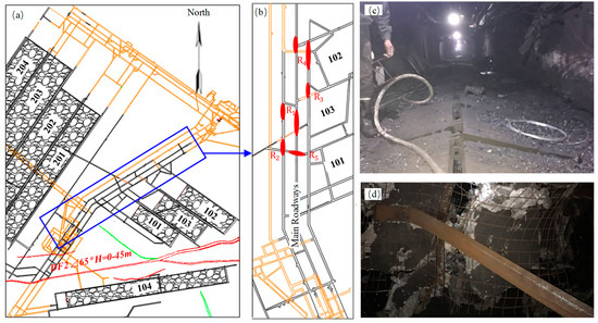 Therefore, in order to avoid the occurrence of rockbursts in the main roadways, a large number of deep-hole blasting measures for the roof strata were implemented to reduce the suspended roof at the working face. Deep-hole blasting measures for roof strata are designed with a hole depth and angle based on the thickness of the roof strata, with a spacing of no more than 5 m and a charge of 4–5 kg. This measure can reduce mining-induced stress caused by working faces [32,33], as is shown in Figure 16b,c.