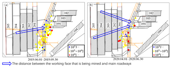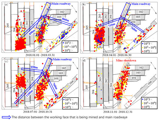 Figure 3 shows the spatial evolution of mining-induced tremors when mining takes place on both sides of the main roadway. According to Figure 3a, during the period from 1 January 2018 to 31 March 2018, the distances between the mining positions of the 104 and 203 working faces and the main roadways were 890 m and 860 m, respectively. Although the distances were very large, tremors greater than 1 × 104 J frequently occurred in the main roadways. As is shown in Figure 3b, during the period from 1 April 2018 to 30 June 2018, as the two working faces were mined toward the main roadways, the distances between the mining positions of the 104 and 203 working faces were about 760 m and 710 m, respectively. It could be seen that the intensity and quantity of mining-induced tremors increased significantly as the distance decreased. In Figure 3c, during the period from 1 July 2018 to 31 March 2018, as the 104 and 203 working faces approached the main roadways, the mining tremor activities near the main roadway became more intense. On 16 August 2018, a rockburst occurred in the main roadways, with a maximum floor heave volume of 1.5 m (as is shown in Figure 2), and caused damage to the main roadways within a radius of 300 m. At this time, the distances between the two working faces and this rockburst were about 650 m and 760 m, respectively. This accident led to the complete shutdown of the coal mine. On 20 October 2018, the mine resumed production. Subsequently, mining was completed at the 203 working face and mining began at the 204 working face, while the mining operations at the 104 working face were nearing completion. Because the influence of mining at the 104 and 203 working faces on the main roadways had not completely dissipated, the mining at the 204 working face intensified the mining tremor activities near the main roadways. Thus, on 4 November 2018, another rockburst occurred in the main roadways (as is shown in Figure 2), with floor heave in the range of about 73 m in regard to the belt roadway and roof fall in the range of about 123 m in regard to the return air roadway. As is shown in Figure 3d, after 4 November 2018, due to this accident, the entire mine was forced to shutdown. During the period from 1 November 2018 to 31 December 2018, although no working face mining took place, many strong tremors still occurred near the main roadways.