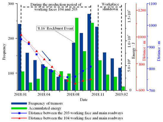 Figure 5 shows the time series of mining-induced tremors occurring near the main roadways in the Gaojiapu coal mine. As is shown in Figure 5, during the simultaneous mining of the 104 and 203 working faces, the number of tremors had an obvious correlation with the distance between the two working faces and the main roadways. The closer the distance between the working faces and the main roadway, the stronger the frequency and energy of the tremors occurring near the main roadways. After November 2018, even when the entire mine was shutdown, the frequency and cumulative energy of the tremors near the main roadway remained high. Such activity then gradually returned to a relatively low level four months later. This indicates that the influence of mining at the working face on main roadways lasts for a long time.