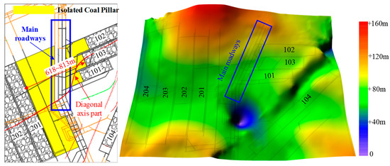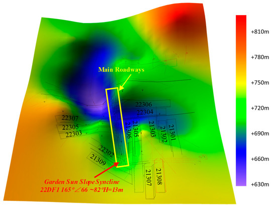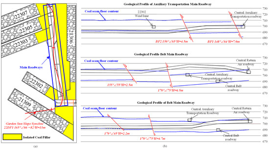 Figure 14 presents top and sectional views of the main roadway in the Cuimu coal mine, and Figure 15 presents a geological map of the main roadways. As is shown in Figure 14a, a large goaf and irregular, isolated coal pillars had been formed around the main roadways. Meanwhile, in Figure 14b, there was relatively thick coal within the main roadways. This led to most of the rockburst events in the Cuimu coal mine being floor heave. Especially, as seen in Figure 9a, when the location of the mining working face passed the syncline axis, the number of tremors near the main roadway significantly increased. The distribution of the tremors extended along the syncline axis, all the way to the main roadways. This indicates that the syncline was a key factor in the stress concentration within the main roadways. These factors were all reasons for the relatively high stress within the main roadways themselves, which is consistent with the research results presented by our predecessors [29,30,31]. The above studies show that the high stress within main roadways themselves combined with the mining activities of working faces led to the occurrence of rockbursts.