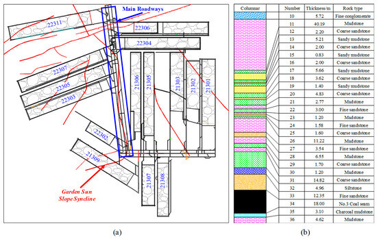 Figure 7 shows the mining engineering diagram and a comprehensive drilling bar chart of the main roadways in the Cuimu coal mine. The thickness of the coal seam in the Cuimu coal mine ranged from 0.35 to 32.55 m, with an average thickness of 18 m. The main roadways included the auxiliary transportation roadway, the conveyor belt roadway, and the return air roadway. They were all arranged in the coal seam and the distance between each main roadway was 40 m, while each roadway was supported in the form of a bolt–cable–anchor net. At this time, a large goaf had been formed around the main roadways. Some areas had become isolated-island areas, with goafs on both sides. Because all three of the main roadways were located in the axis of the Garden Sun Slope Syncline, the floor of the main roadways was mainly composed of relatively thick coal, in local areas. The immediate roof of the coal seam was made of 12.35 m of fine sandstone and the immediate floor was mainly composed of carbonaceous mudstone.