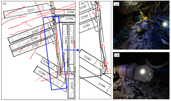 The damage caused by rockbursts to the main roadways in the Gaojiapu coal mine: (a,b) top and partially enlarged views of rockburst accidents in main roadways; the roof fall and floor heave accidents on 16 June 2018; the roof fall accident on 1 July 2019; the roof fall and floor heave accidents on 15 August 2018 and the roof fall accident on 7 September 2018; the floor heave accident on 2 April 2018, the floor heave accident on 6 April 2018, and the roof fall accident on 12 April 2018; the roof fall and floor heave accidents on 4 November 2018; (c,d) photos of the rockburst damage.