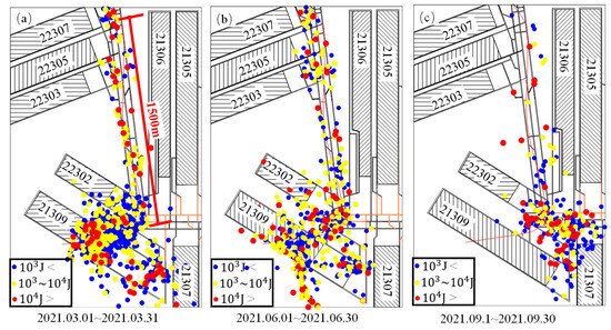 The spatial evolution of mining-induced tremors when mining the 21309 working face near the main roadway: (a) 1 March 2021 to 31 March 2021, (b) 1 June 2021 to 30 June 2021, and (c) 1 September 2021 to 30 September 2021.