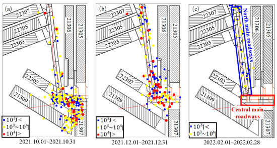 Tremor activities near main roadways during the mining of the 21309 working face: (a) 1 October 2021 to 31 March 2021, (b) 1 December 2021 to 31 December 2021, and (c) 1 February 2022 to 28 February 2022.