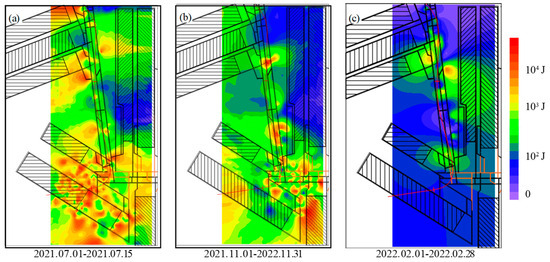 Energy accumulation during and after the mining of the 21309 working face: (a) 1 July 2021 to 15 July 2021, (b) 1 November 2021 to 31 November 2022, and (c) 1 February 2022 to 28 February 2022.