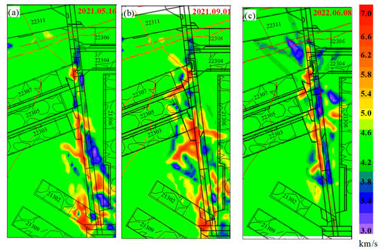 Seismic velocity tomography of stress field around the main roadways: (a) 16 May 2021, (b) 1 September 2021, and (c) 8 June 2022.