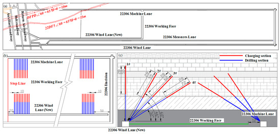 Deep-hole blasting of roof strata at the 22306 working face: (a) the top view of the 22306 working face; (b) the top view of the deep-hole blasting measure; (c) the sectional view of the deep-hole blasting measure.