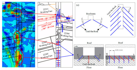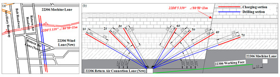 Figure 16 shows the measures involving the deep-hole blasting of the roof strata during the mining of the 22306 working face. As can be seen from Figure 8 and Figure 16a, the geological and mining environment of the 22306 working face and the 21309 working face were similar and both working faces were mined facing the main roadways. When the 22306 working face was mined, the probability of rockburst occurrence in the main roadways was bound to be very high.