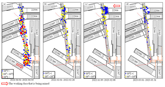Distribution of the tremors near the main roadways during the mining of the surrounding working faces: (a) 1 April to 30 April 2021, (b) 1 February 2022 to 28 February 2022, (c) 9 November 2022 to 8 February 2023, and (d) 1 March 2023 to 31 March 2023.