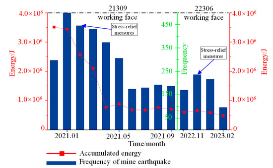 Figure 20 shows the time series of the tremors near the main roadways as a result of the mining at the 21309 and 22306 working faces in the Cuimu coal mine. As can be seen from Figure 20, when the 21309 working face was mined, the tremors near the main roadway were strong. During the mining period of the 22306 working face, due to the implemented stress relief measures to the 22306 working face and the main roadways, the frequency and energy of the tremors were significantly reduced compared with those of the 21309 working face. This indicates that the implemented stress relief measures were very effective and avoided the reoccurrence of rockbursts in the main roadways.