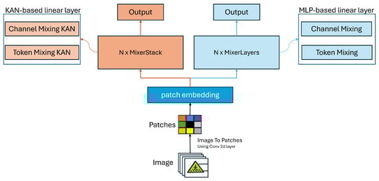 The KAN-Mixer [23] architecture initiates with an input image X of shape , where B represents the batch size, C signifies the number of channels, H denotes the height, and W specifies the width of the image. Subsequently, the image is fragmented into nonoverlapping patches using the image-to-patches module, each of size , leading to the creation of patches. Ultimately, the image is restructured into a sequence of patches with shape , where N signifies the total number of patches.
