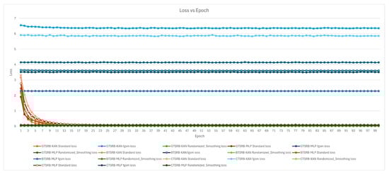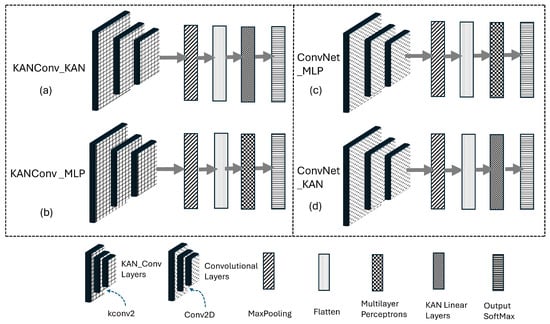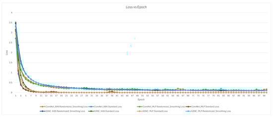 The training performance of the ConvNet_KAN, ConvNet_MLP, KANC_KAN, and KANC_MLP models is depicted in Figure 9, which shows loss during the training phase, respectively, over 100 epochs.