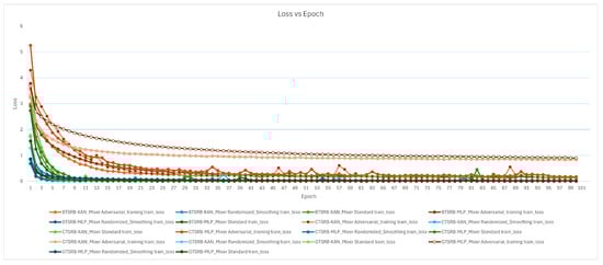 Figure 9 illustrates the loss values over training epochs. Initially, all models showed a sharp decrease in loss, especially in the early epochs, before stabilizing at lower values. ConvNet_KAN with randomized smoothing demonstrated the fastest loss reduction and achieves the lowest final loss, indicating superior optimization and convergence. The other models followed similar loss reduction trends but converged slightly slower, with KANC_KAN and ConvNet_MLP showing comparable final loss values.