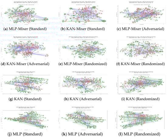 For instance, under an FGSM attack with , the MLP-Mixer trained under standard conditions (Figure 10a) exhibited significant latent space shifts, resulting in numerous disrupted correct classifications. Conversely, the KAN-Mixer trained using standard settings (Figure 10b) showed less movement, reflecting better robustness even under the same attack conditions. Furthermore, when trained, the KAN-Mixer (Figure 10d) demonstrated even less movement in the latent space compared to the MLP-Mixer under adversarial training (Figure 10c), emphasizing its greater resilience to adversarial perturbations. Similarly, the KAN-Mixer model trained with randomized smoothing (Figure 10f) showed the most constrained latent space movement, underscoring its robustness, whereas the MLP-Mixer trained with randomized smoothing (Figure 10e) still exhibited more substantial latent space shifts. These visualizations emphasize the superior stability of KAN-Mixer models under adversarial conditions across different training strategies.