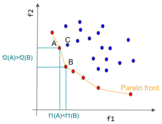 - Pareto dominance: for multiple objective values, random independent variables x1, x2, for any objective function with f(x1) < f(x2), then x1 dominates x2.