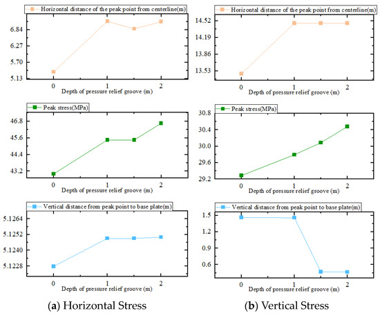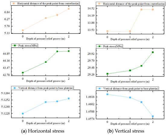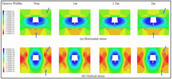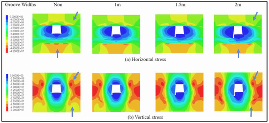 - Grooving for stress relief exhibits significant stress transfer effects, with a clear trend of stress concentration moving in the direction away from the tunnel. Central grooving proves to be more effective than corner grooving, as corner grooving can cause a certain degree of asymmetric stress distribution.