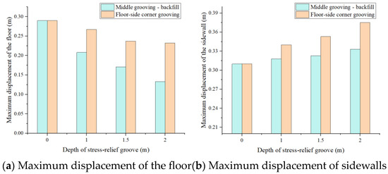 - While floor grooving reduces displacement at the tunnel floor, it increases displacement at the tunnel sides, with the impact of the groove’s depth being more significant than its width. Changes in the tunnel structure due to grooving may lead to conflicts in surrounding rock control; however, backfilling the central floor post-grooving can effectively reduce side displacements.