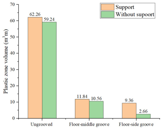 - As the depth and width of the groove increase, the volume of the plastic zone continuously decreases. Under high-ground stress conditions, support measures can slightly reduce the volume of the plastic zone, although this reduction is relatively modest.