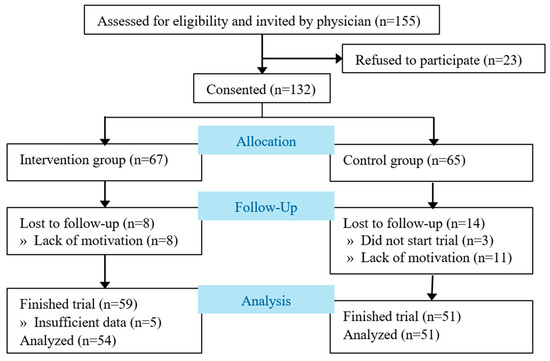 In the control group, 65 volunteers gave informed consent between January 2022 and February 2023. A total of 62 started the trial, and 51 finished it successfully (27 women and 24 men). The main reasons for dropouts were the COVID-19 pandemic and a lack of motivation. Patient recruitment took place in the municipal district of the city of Szeged, Hungary. The flow of participants is summarized in Figure 1.