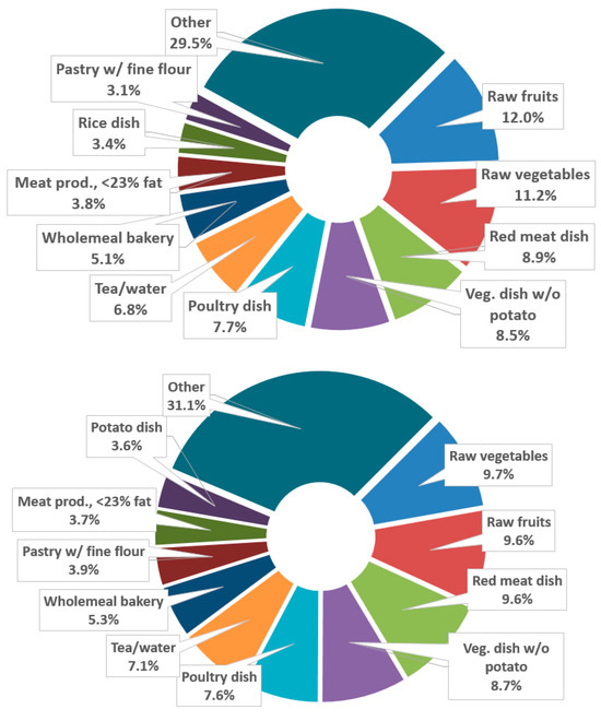Weight ratios of the 10 most relevant food sets of the successful weight loser (top) and the unsuccessful weight loser groups (bottom), according to the cleaned dietary logs. Percentage values are group averages.