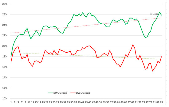 As an example, the weight ratio of the most important raw vegetable/fruit set is illustrated in Figure 3, averaged for the SWL (with a significant trend) and UWL (with no significant trend) sub-groups, in the function of the time.