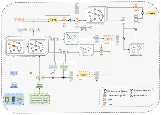 Figure 1 illustrates the comprehensive structure of the UPGCN model. UPGCN primarily consists of the UPEM and the multimodal two-step enhanced fusion method, which work together to achieve more precise representations of users and items. First, the enhanced signal is obtained by enhancing the item ID embedding using the transformed multimodal features of the item as the enhancing signal, thus obtaining and . Then, the user representation is obtained by performing graph convolution on the user–item interaction graph using the multimodal features of the item as input, obtaining and . Subsequently, the item representation is obtained by performing graph convolution on the same interaction graph using the user representation , as input, obtaining and in different modalities. These item representations, along with the enhanced item ID embeddings and , are fed into the enhancement module for further processing and fusion, producing . Then, use the item representations and from different modalities as inputs, and perform graph convolution on the item–item graph in different modalities to obtain preliminary disentangled item representations and with reduced similarity. Finally, , and the item representation , obtained in different modalities are fused, and the final item representation generated by the multimodal two-step enhanced fusion method is output. Furthermore, to effectively extract user preference information across different modalities, the user representations and derived from these modalities serve as guiding signals for enhancing the user ID embedding. An attention mechanism is employed to quantify the user’s focus on each modality’s information, which is subsequently integrated into the user ID embedding for subsequent embedding learning. Building upon this framework, embedding learning is conducted on the user–item interaction graph to derive final representations of users and items that facilitate accurate predictions of user preferences.