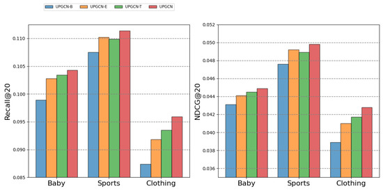 The comparison results for R@20 and N@20 are presented in Figure 2. By comparing the performance of UPGCN-E and UPGCN-B, it is evident that incorporating the UPEM has resulted in significant enhancements in both Recall@20 and NDCG@20 across all datasets. This indicates that UPEM has played a positive role in capturing user preference information and improving recommendation performance. Comparing UPGCN-T with UPGCN-B shows that the multimodal enhanced fusion method has also significantly improved the model’s performance in Recall@20 and NDCG@20. In particular, the multimodal enhanced fusion method has a particularly noticeable impact on improving recommendation performance in the Clothing dataset, further indicating that the method can effectively improve recommendation results on large-scale datasets.