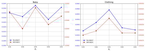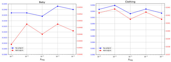 In the Baby dataset, the Recall@20 and NDCG@20 metrics show a noticeable fluctuation within a small range of . Initially, Recall@20 is close to 0.1035 when is 1 × 10−5, and both Recall@20 and NDCG@20 slightly decrease as increases to 1 × 10−3, indicating that the model’s dependence on multimodal features has not been fully stimulated at this point. When is increased to 1 × 10−2, both Recall@20 and NDCG@20 reach relatively high values simultaneously, with Recall@20 at 0.1043 and NDCG@20 at 0.0451. This result shows that the introduction of multimodal BPR loss with moderate weight strength effectively enhances the model’s recommendation performance, especially when user and item features from different modalities are fully fused. However, when is increased to 0.1, performance slightly declines again, indicating that the model may suppress multimodal features if it pays too much attention to feature extractor optimization, preventing the model from fully learning the multimodal information that is effective in predicting user preferences.