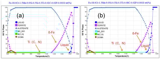 AISI 321 stainless steel JMatPro phase diagram simulation, (a) 0.02 wt.% C; (b) 0.08 wt.% C.