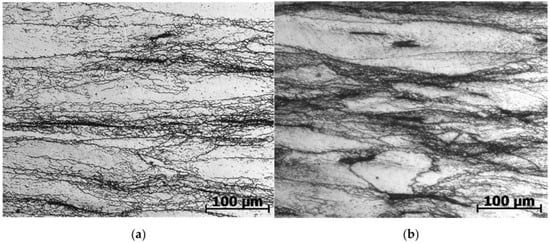 The microstructure of AISI 321 steel after thermal deformation at 1000 °C, (a) strain rate is 0.01 s−1; (b) strain rate 0.1 s−1 [14].
