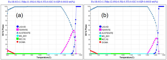 AISI321 stainless steel JMatPro phase diagram simulation, (a) 11 wt.% Ni; (b) 12 wt.% Ni.