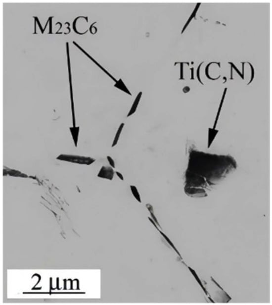 Cr23C6 phase is an important factor affecting the corrosion resistance and high-temperature creep characteristics of AISI 321 stainless steel. The formation of Cr23C6 phase usually occurs close to the grain boundaries, where an amount of chromium present in the ferrite readily precipitates, leading to the redistribution at the austenite grain boundaries (Figure 4) [16]. It is a linear relationship between the susceptibility of AISI 321 stainless steel to intergranular corrosion and the volume of precipitated Cr23C6 phase, and it is on account of the chromium-depleted zones resulting from Cr23C6 precipitation that initiate intergranular corrosion [23]. Furthermore, Chen, H examined the microstructure of AISI 321 stainless steel at mid-creep (around half its endurance limit) and found that dislocations were anchored by Cr23C6 particles of about 40 nm. As creep progressed further, nearing the end of its lifetime, the Cr23C6 near dislocations grew to 600 nm, with finely dispersed Cr23C6 playing a key role in pinning dislocations and grain boundaries, which is instrumental in enhancing the high-temperature characteristics of the material [24].