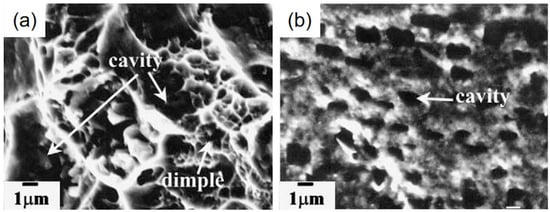 Min, K.S and his team successfully synthesized AISI 321 stainless steel with equivalent-sized TiC and Cr23C6 particles after sensitization. They then conducted high-temperature creep and impact experiments on the material. The resulting fracture morphology is depicted in Figure 5. The findings indicate that AISI 321 stainless steel containing TiC particles exhibits fewer pores and smaller toughness dimples compared to its counterpart containing Cr23C6, which has a higher porosity. Furthermore, the fracture mode of the TiC-aged alloy is more ductile than that of the Cr23C6-aged alloy. This ductility can be attributed to the strong interfacial affinity between TiC and the matrix, which acts as a barrier to void formation and growth [27]. Importantly, maintaining smaller carbide sizes amplifies their pinning effect on dislocations, thereby preventing a reduction in dislocation density during prolonged creep deformation, which is crucial for maintaining the material’s structural integrity [28].