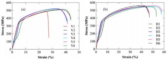 Stress–strain curves of AISI 321 stainless steels in different directions, (a) vertical; (b) horizontal [33].