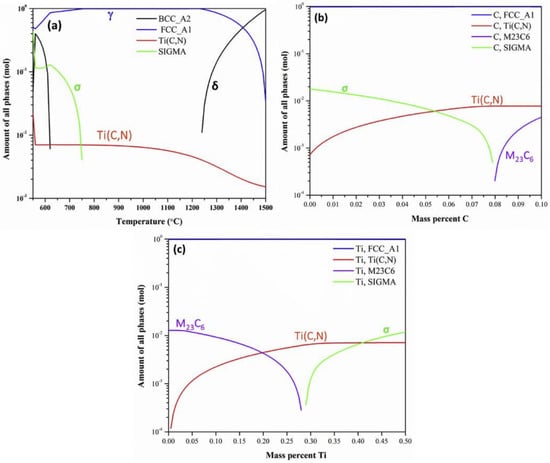 Phase diagram simulation, (a) thermodynamic property diagram; (b) C content of 0–0.1 wt.%; (c) Ti content of 0–0.5 wt.% [36].