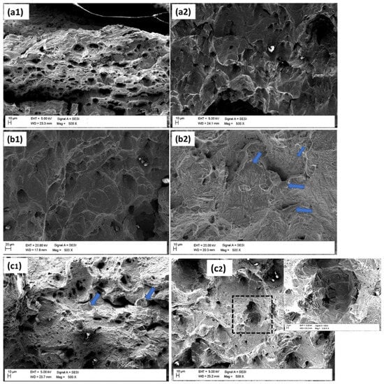 Morphology of impact fracture surfaces of different specimens of AISI 321 stainless steel (Indicate shallow pits with arrows), (a1,a2) solution annealed, aged at 750 °C for: (b1,b2) 700 h; (c1,c2) 1500 h [36].
