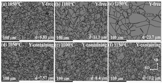 The grain boundary map of (a–c) Y-free and (d–f) Y-containing simples at 1050 °C, 1100 °C, and 1150 °C [39].